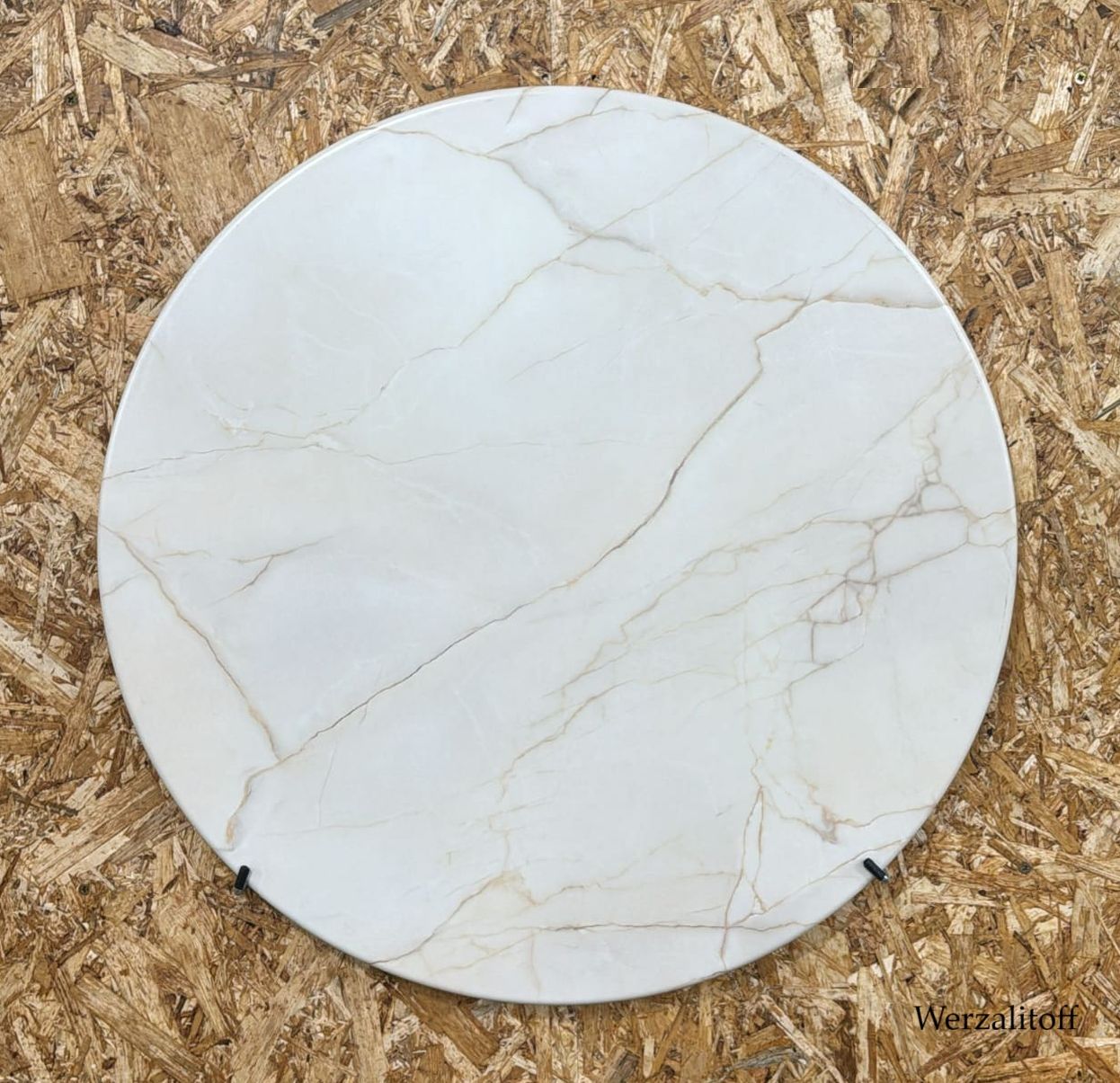 Столешница werzalit круглая для кафе, бара, ресторана, пиццерии, патио, кофейни, фудкорта, террасы, веранды, отеля, салона красоты, офиса, столовой, бистро, гостиной и кухни. Столешница из плиты ДСП с пластиковым покрытием декор белый мрамор. Поверхность столешницы покрыта пластиком методом горячего прессования. Формованная монолитная столешница без швов и кромок. Столешницы для золотых подстолий, хромированных подстолий, подстолий из нержавейки, подстолий из нитрида титана золотого цвета, металлических подстолий, алюминиевых подстолий, чугунных подстолий. Столешница для обеденного стола размер d70 см.